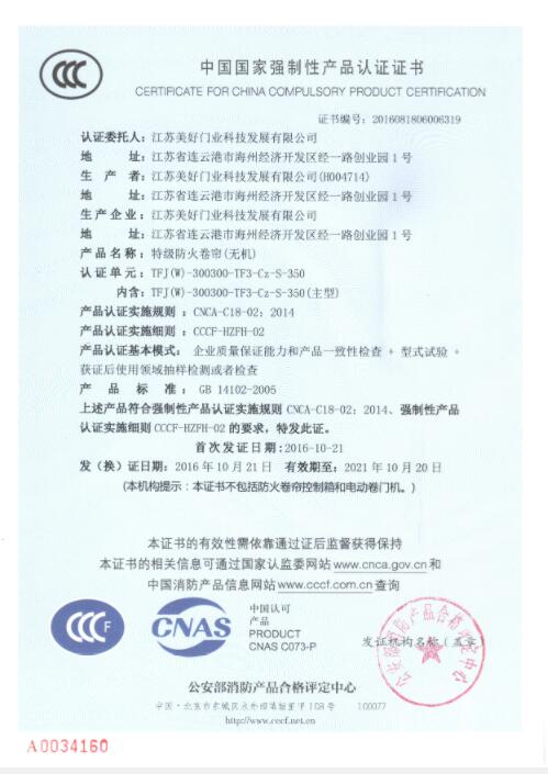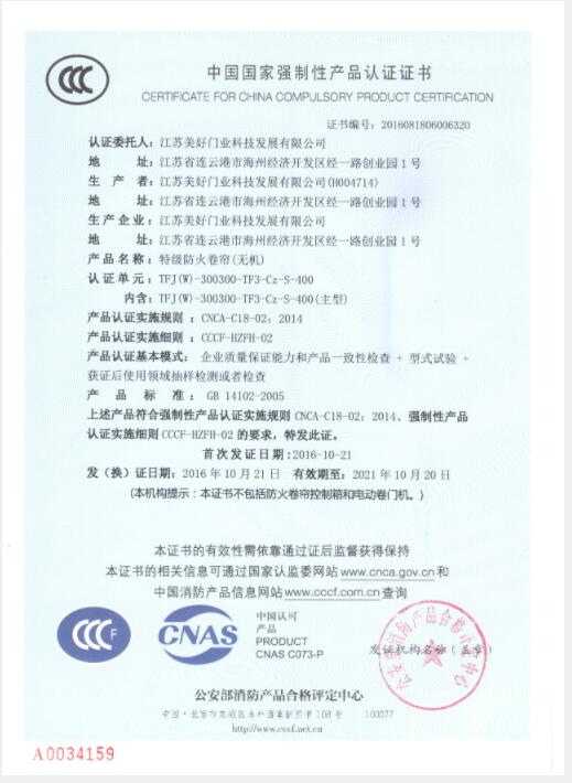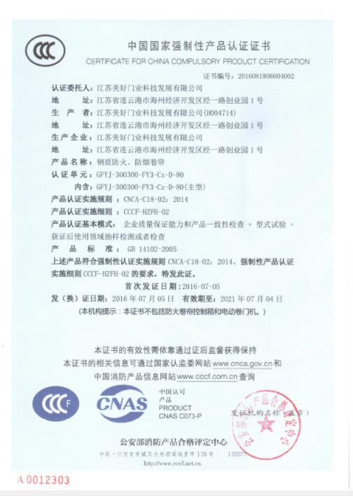 江蘇美好門業(yè)科技發(fā)展有限公司防火卷簾門順利通過公安部消防產(chǎn)品合格評定中心的檢測并榮獲3C證書