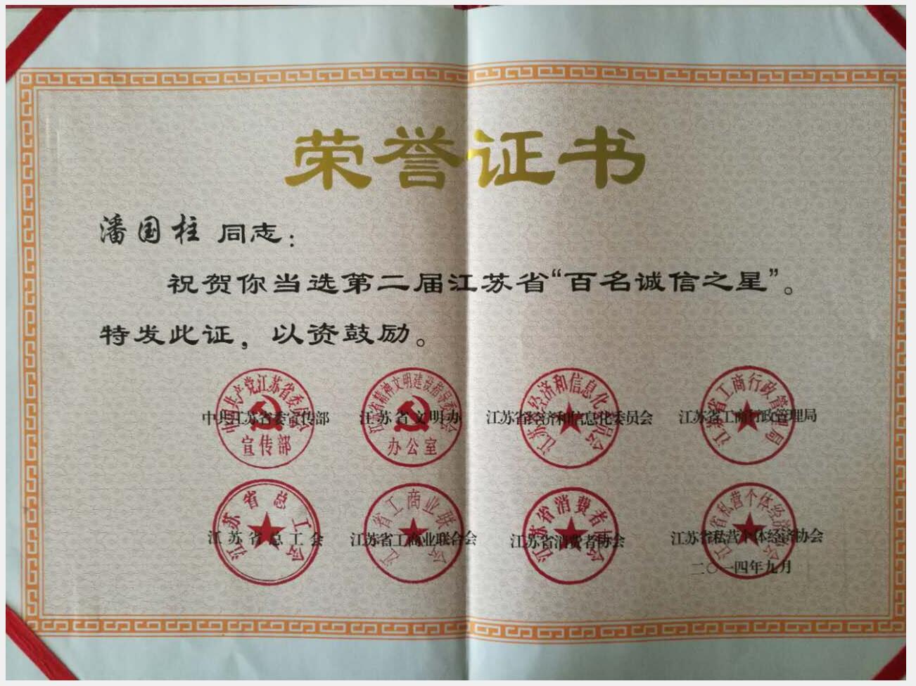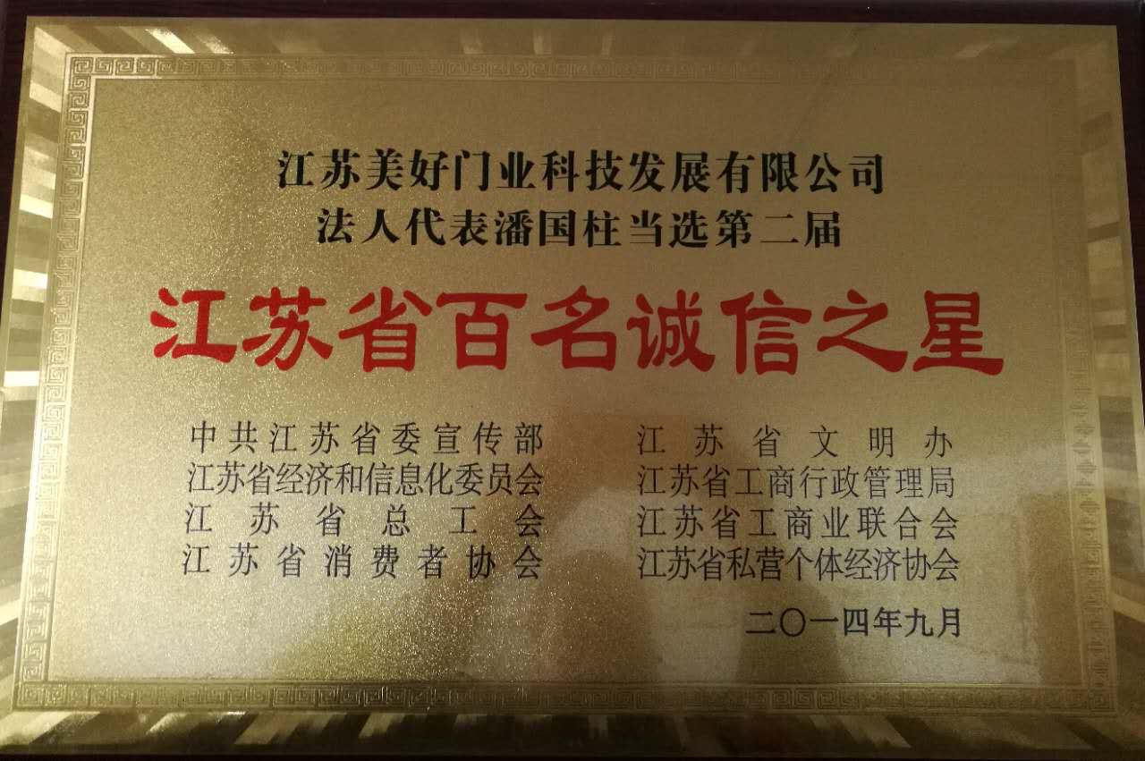 江蘇美好門(mén)業(yè)科技發(fā)展有限公司法人代表潘國(guó)柱當(dāng)選第二屆江蘇省百名誠(chéng)信之星