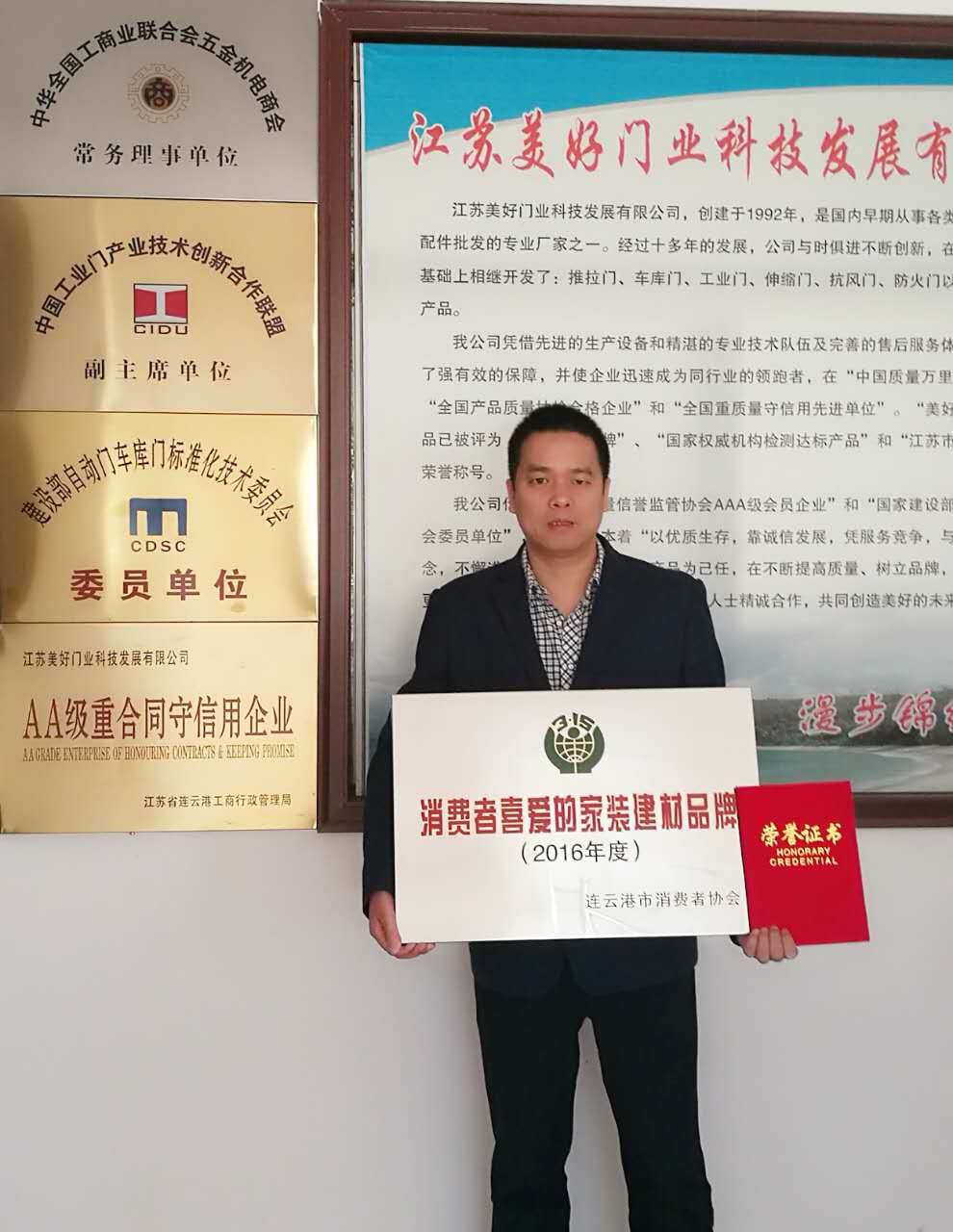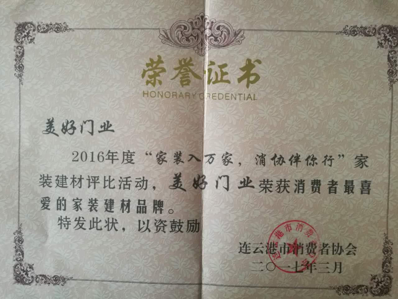 江蘇美好門業(yè)科技發(fā)展有限公司,在2016年度“家裝入萬家,消協(xié)伴您行”家裝建材評(píng)比活動(dòng)中,被連云港市消費(fèi)者協(xié)會(huì)授予“消費(fèi)者最喜歡的家裝建材品牌”榮譽(yù)稱號(hào)。