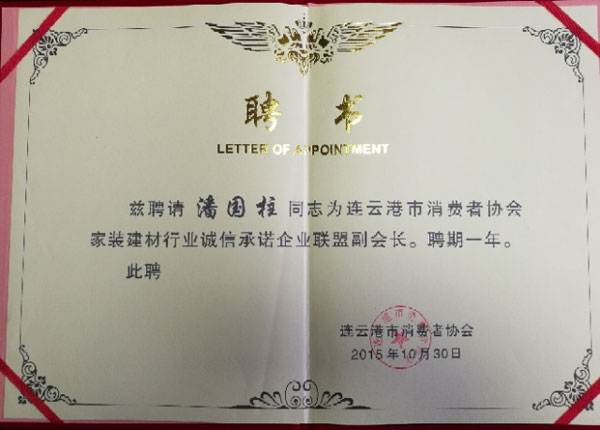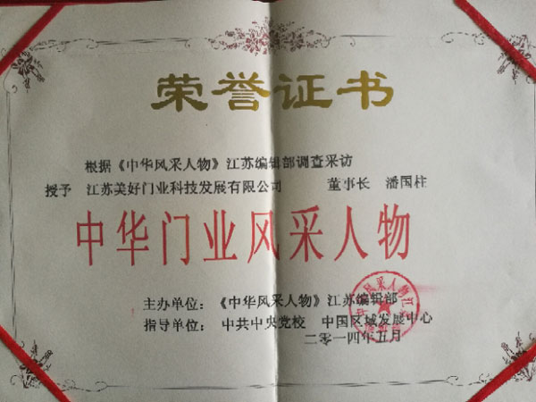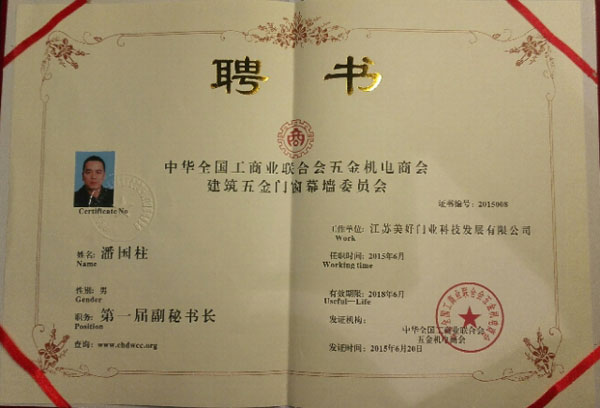 江蘇美好門業(yè)科技發(fā)展有限公司董事長(zhǎng)潘國(guó)柱連云港市門窗協(xié)會(huì)會(huì)長(zhǎng)連云港市公益文化傳播協(xié)會(huì)黨支部書記全國(guó)工商聯(lián)五金建筑門窗委員會(huì)副秘書長(zhǎng)中國(guó)工業(yè)門產(chǎn)業(yè)技術(shù)創(chuàng)新聯(lián)盟副主席連云港市私營(yíng)個(gè)體經(jīng)濟(jì)協(xié)會(huì)副會(huì)長(zhǎng)連云港市民營(yíng)企業(yè)家協(xié)會(huì)副會(huì)長(zhǎng)連云港市慈善總會(huì)1加1慈善分會(huì)常務(wù)副會(huì)長(zhǎng)連云港市消費(fèi)者協(xié)會(huì)家裝建材行業(yè)聯(lián)盟副會(huì)長(zhǎng)江蘇省誠(chéng)信企業(yè)家連云港市十大誠(chéng)信標(biāo)兵江蘇省百名誠(chéng)信之星中華門業(yè)風(fēng)采人物行業(yè)突出貢獻(xiàn)獎(jiǎng)全國(guó)工商聯(lián)五金建筑門窗委員會(huì)優(yōu)秀工作者