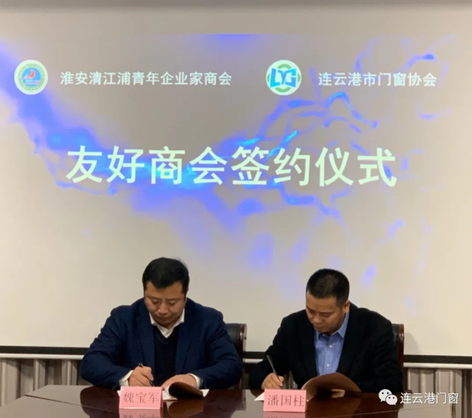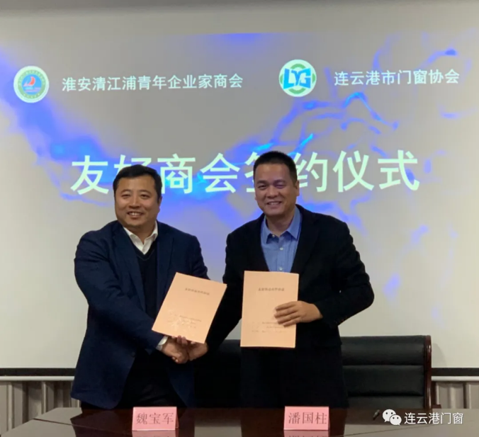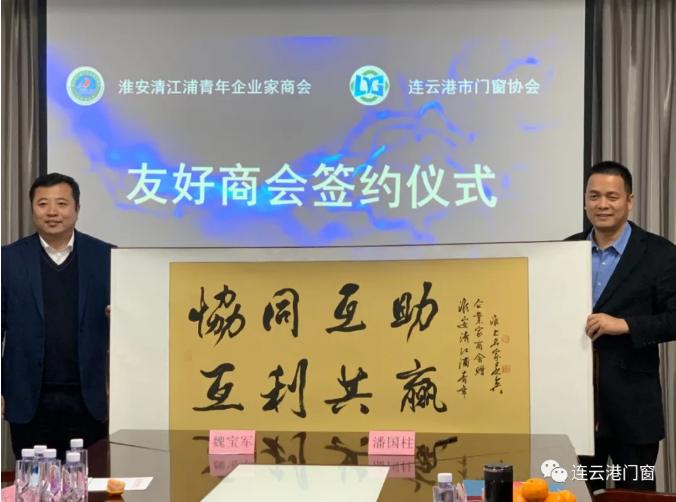 ? ? ? 連云港市門窗協(xié)會潘國柱會長和淮安清江浦青年企業(yè)家商會魏寶軍會長簽約友好協(xié)議。并互贈禮品。