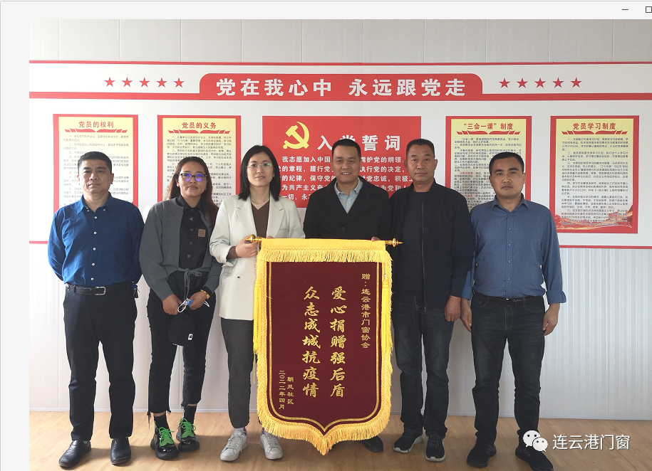 5月11日海州區(qū)南城街道周書記攜街道朝鳳社區(qū)的江書記來到市門窗協(xié)會黨支部,為我會送來一面內(nèi)容為“愛心捐贈強后盾,眾志成城抗疫情”的錦旗,對我會會員在疫情期間聯(lián)合朝鳳社區(qū)抗擊疫情、捐獻物資助力一線防疫人員的善舉表示感謝!